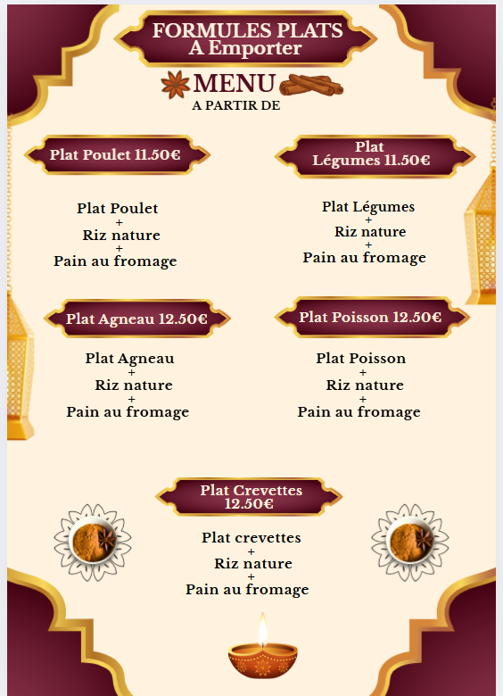 TOUS NOS PLATS SONT ACCOMPAGNÉS DE RIZ BASMATI NATURE ET PAIN FARCI AU FROMAGE DU